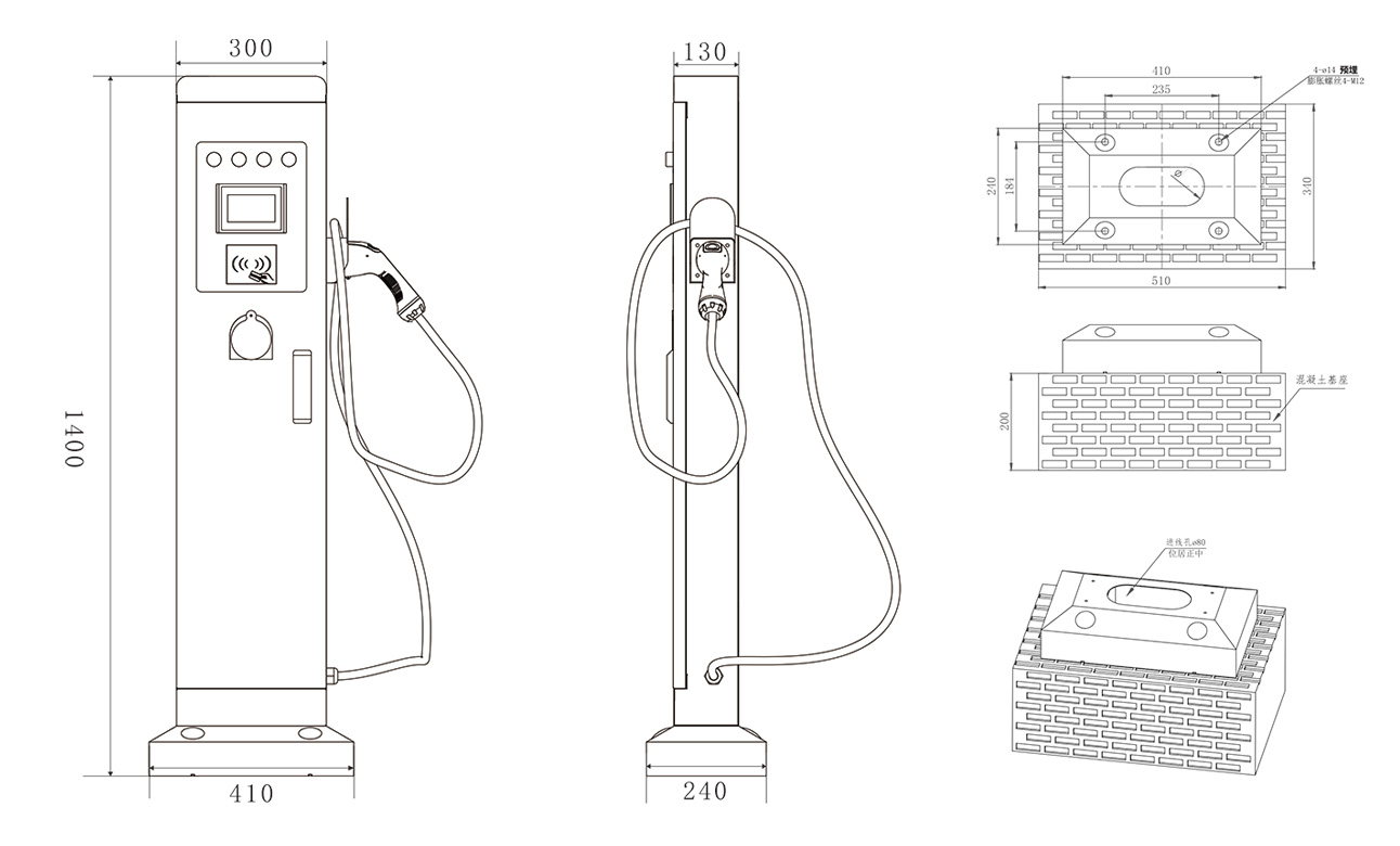 详细规格 产品型号 NJAC-7000-LD 外观结构 产品属性 落地式单枪7KW 设备尺寸 1400mm*410mm*240mm(L*W*T) 安装方式 地面开孔安装 走线方式 下进下出 线缆长度 5M 电气指标 输入电压 220V±20% 输入频率 50±5HZ 额定功率 7KW 输出电流 32A 功能设计 人机界面 刷卡、扫码、急停按钮、LED指示灯 通讯接口 支持4G/2G、以太网 安全设计 安规标准 GB/T18487-2015 保护设计 浪涌、过流、过压、漏电、欠压、短路保护 环境指标 使用环境 户内/户外 工作温度 -20℃~50℃ 防护等级 IP54