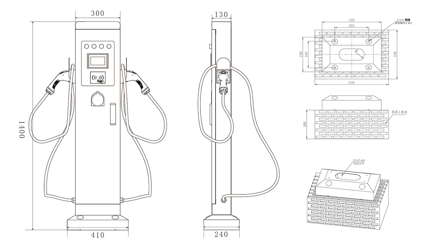详细规格 产品型号 NJAC-7000-LS 外观结构 产品属性 落地式双枪7KW 设备尺寸 1400mm*410mm*240mm(L*W*T) 安装方式 地面开孔安装 走线方式 下进下出 线缆长度 5M 电气指标 输入电压 220V±20% 输入频率 50±5HZ 额定功率 2*7KW 输出电流 2*32A 功能设计 人机界面 刷卡、扫码、急停按钮、LED指示灯 通讯接口 支持4G/2G、以太网 安全设计 安规标准 GB/T18487-2015 保护设计 浪涌、过流、过压、漏电、欠压、短路保护 环境指标 使用环境 户内/户外 工作温度 -20℃~50℃ 防护等级 IP54