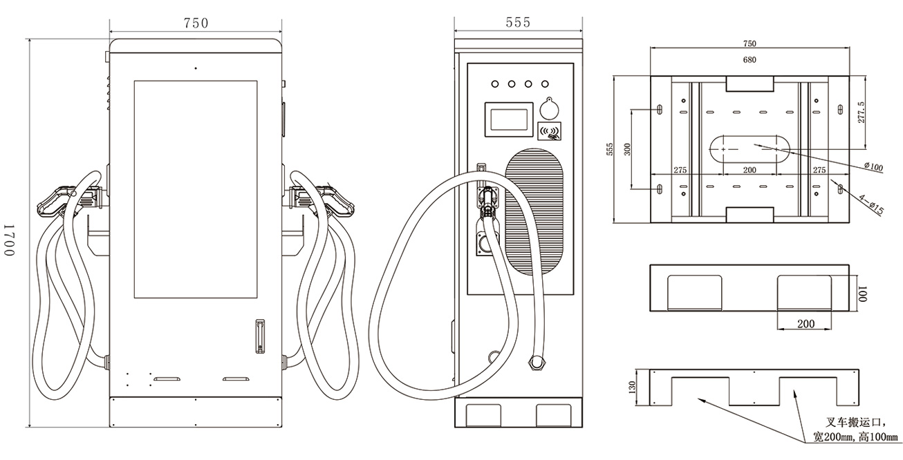 详细规格 产品型号 NJKC-60-120 外观结构 产品属性 直流桩60KW-120KW 设备尺寸 1700mm*750mm*555mm(L*W*T) 电气指标 输入电压 AC380V±15%三相 输入频率 50HZ±5HZ 输出电压 DC200-750V 输出电流 110-440A 额定功率 (60-120 )KW 稳压精度 ≤±5% 稳流精度 ≤±1% 波纹系数 ≤±0.5% 谐波电流 ≤5% 充电效率 ≥93% 功能设计 通讯接口 支持4G/2G、以太网 冷却方式 风冷 环境指标 使用环境 户内/户外 工作温度 -20℃~50℃ 防护等级 IP54